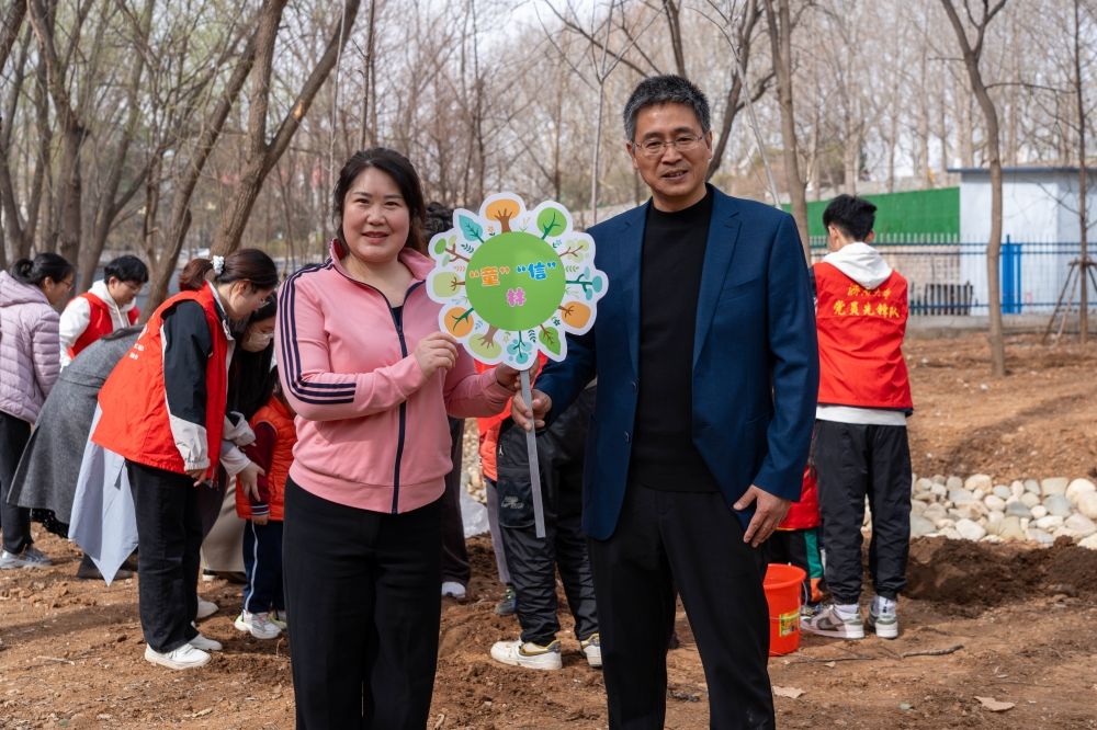 活动现场,学院各班级与幼儿园大班、中班、小班结对,组成“护绿小分队”。大学生与孩子们分工协作,挥锹铲土、扶苗培土、提桶浇水,共同栽种树苗。大学生们耐心示范植树技巧,孩子们则用稚嫩的小手扶稳树苗,并在树旁插上“班级结对认养牌”,象征着共同守护绿色未来的承诺。最后,夏卫东与万晓霞共同为“‘童’‘信’林”揭牌。