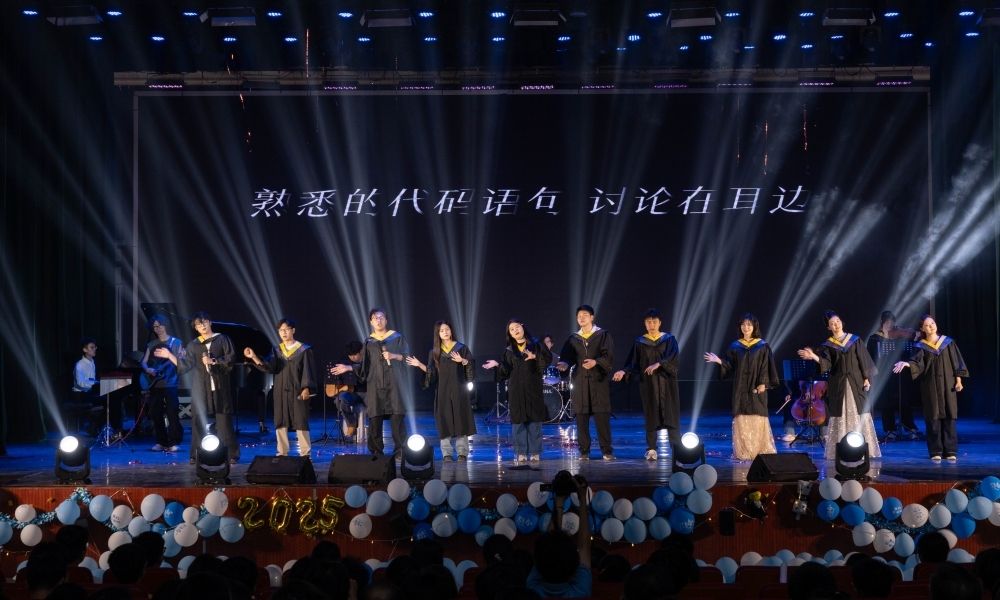 晚会在乐队表演的《不说再见》和《闪耀》中拉开序幕,激昂的旋律里,唱出了毕业生们对校园的眷恋与未来的憧憬。随后,学院李童童老师带来大气磅礴的独唱《和谐中国》,用歌声传递家国情怀,以优美旋律唱响时代华章。当《平凡之路》《你曾是少年》《凤凰花开的路口》这些熟悉的旋律响起,台下观众自发点亮手机闪光灯,化作星海随节拍轻轻摇曳,全场沉浸在这场关于青春、成长与告别的集体回忆中。活力四射的舞蹈串烧《Funk Alarm》和《One Spark》中,2023级辅导员郑威老师与Only Crew舞社的同学们以极具感染力的舞姿,完美演绎了青春的蓬勃朝气与无限可能。在庄重激昂的朗诵节目《廉洁颂》中,用掷地有声的语调、饱满真挚的情感,为青春年华注入清正廉洁的责任底色。灯影戏《我们的四年青春》以其独特的艺术形式成为最动人的“情感催化剂”,通过光影的魔力将大学四年的成长蜕变、青春追忆与离别愁绪娓娓道来,引发全场共鸣。毕业生们自己作词改编的歌曲《二环南路的日子》,以饱含深情的歌词和旋律,为全场带来了一场对“济大”的青春告白,让四年的欢笑与泪水都在歌声中得到了最完美的诠释。在晚会的尾声,一曲精心编排的歌曲串烧《光阴的故事》与《明天会更好》将现场气氛推向高潮,当熟悉的旋律响起,台上台下共同哼唱,共同谱写毕业季最动人的青春乐章。