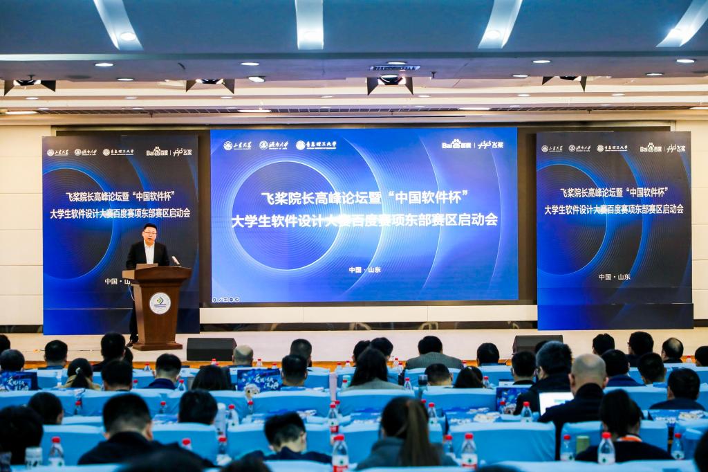 为了促进山东区域产业与高校更好融合,助力高校开展人工智能人才培养,加强区域内兄弟高校间交流探讨,凝聚共识,打造产学研用标杆,贯彻产教融合模式创新与合作落实,3月25日,百度飞桨协同pg娱乐电子游戏官网入口、山东大学、青岛理工大学在pg娱乐电子游戏官网入口第一学术报告厅举办飞桨院长高峰论坛暨“中国软件杯”大学生软件设计大赛百度赛项东部赛区启动会。本次活动由pg娱乐电子游戏官网入口承办,山东大学、青岛理工大学联合举办,济南市市中区副区长张源,pg娱乐电子游戏官网入口党委副书记杨景波,青岛理工大学党委常委、副校长王在泉,山东大学团委书记姜炳刚,pg娱乐电子游戏官网入口团委和pg娱乐电子游戏官网入口相关负责人出席本次活动,山东大学、中国海洋大学、中国石油大学等17所高校的院系负责人,市中区以及百度公司、中国软件杯组委会等相关负责人参加活动。活动由pg娱乐电子游戏官网入口副院长荆山主持。