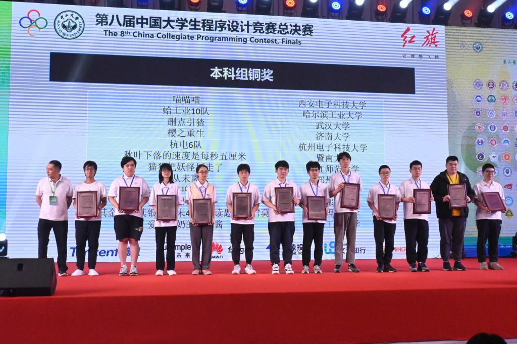 5月13至14日,第八届中国大学生程序设计竞赛(CCPC)总决赛在广州中山大学成功举行。由pg娱乐电子游戏官网蒋彦老师指导,pg娱乐电子游戏官网张益铭、刘延松,数学科学学院龚奕天3名同学组成的“樱之重生”代表队与来自全国114所高校的128支队伍同台竞技,经过5个小时的奋力拼搏,最终获得总决赛铜奖第4名的好成绩。