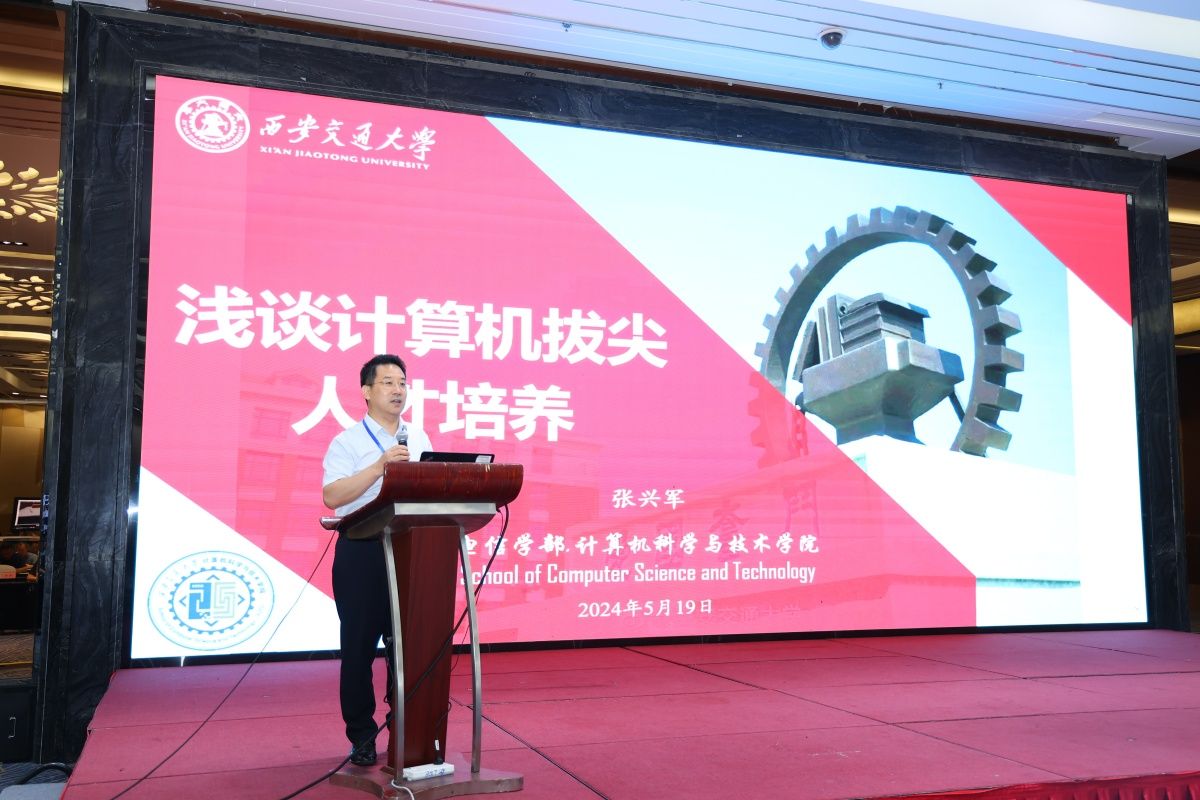 西安交通大学计算机科学与技术学院院长张兴军作了题为“浅谈计算机拔尖人才培养”的特邀报告。报告中,张兴军从教育部、学校和计算机学科层面分享了计算机拔尖人才培养的重要意义。他结合西安交通大学计算机学院拔尖人才培养的具体措施和成功经验,强调了培养学生创新精神、团队合作能力以及解决实际问题的能力的重要性。
