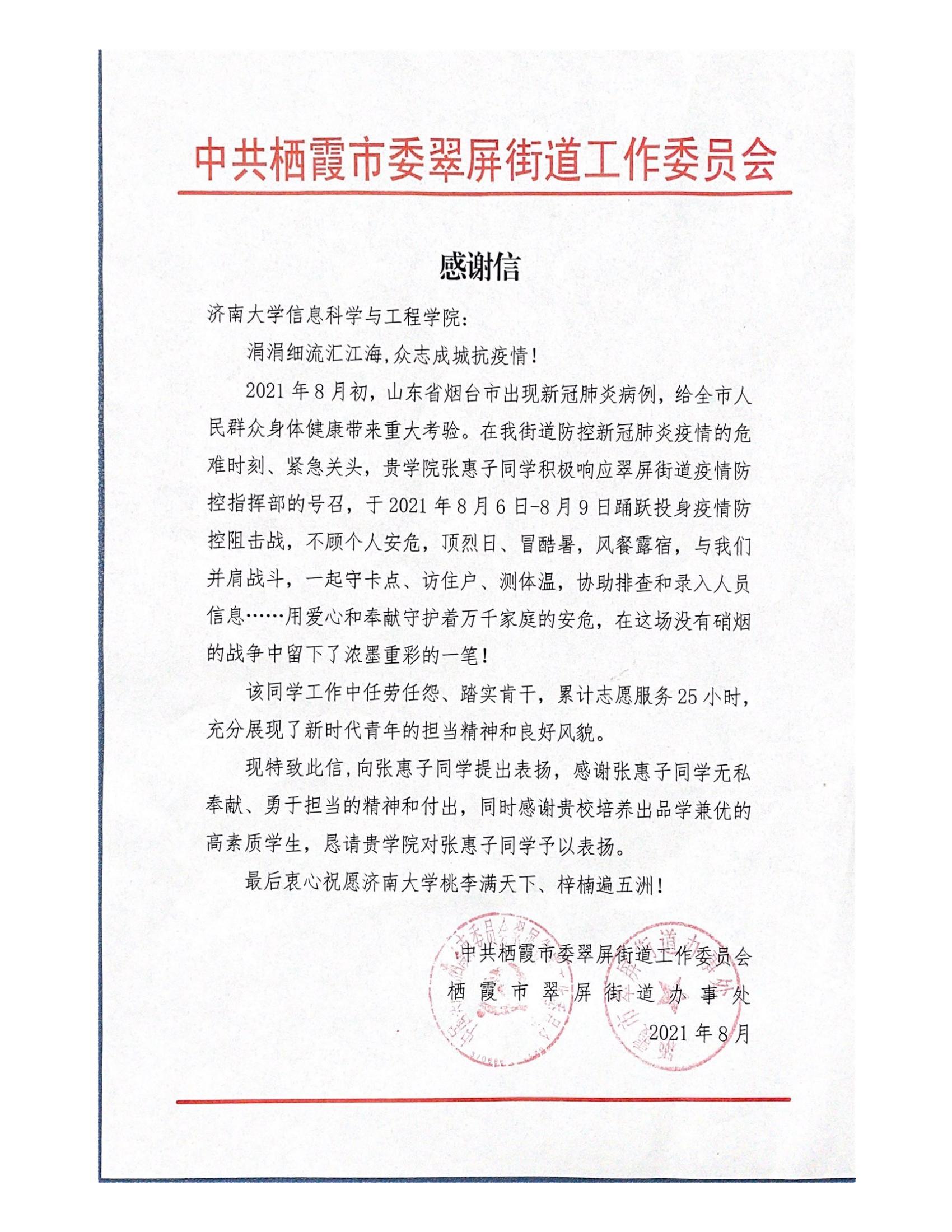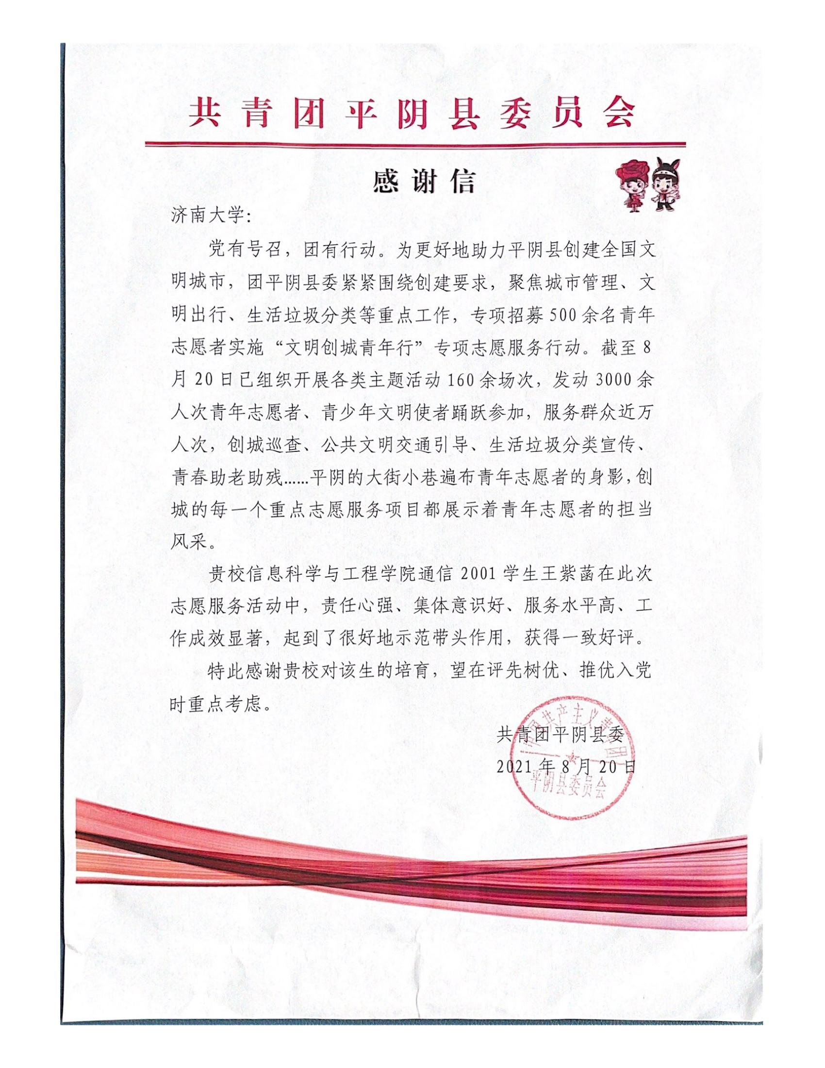 近日,pg娱乐电子游戏官网入口收到来自共青团平阴县委员会和中共栖霞市翠屏街道工作委员会的感谢信,感谢pg娱乐电子游戏官网学生王紫菡和张惠子在志愿服务活动中的积极表现以及担当精神。