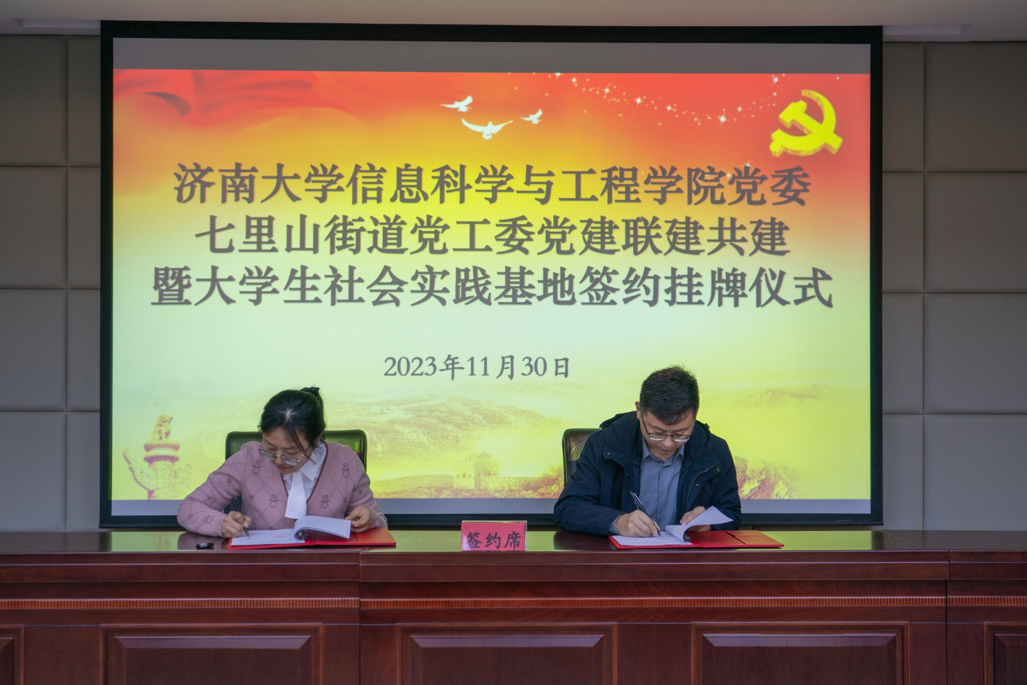 为了深入贯彻落实习近平新时代中国特色社会主义思想和党的二十大精神,积极响应团中央“百万大学生进社区”的号召,进一步推进校地融合、双向共建,搭建高校人才到基层实践锻炼平台,通过党建引领,共同探索基层治理新模式、新路径,11月30日上午,pg娱乐电子游戏官网入口与济南市市中区七里山街道党工委党建联建共建暨大学生社会实践基地签约挂牌仪式在七里山街道党群服务中心举行,共青团济南市市中区委书记党淼,济南市市中区七里山街道党工委书记张志杰,党工委副书记李威,党工委委员、办事处副主任隗娜,pg娱乐电子游戏官网入口团委书记胡春毅,pg娱乐电子游戏官网入口党委书记夏卫东,党委副书记、副院长郝伟,七里山街道相关负责人,学院全体辅导员以及学生志愿者代表参加仪式。仪式由隗娜主持。