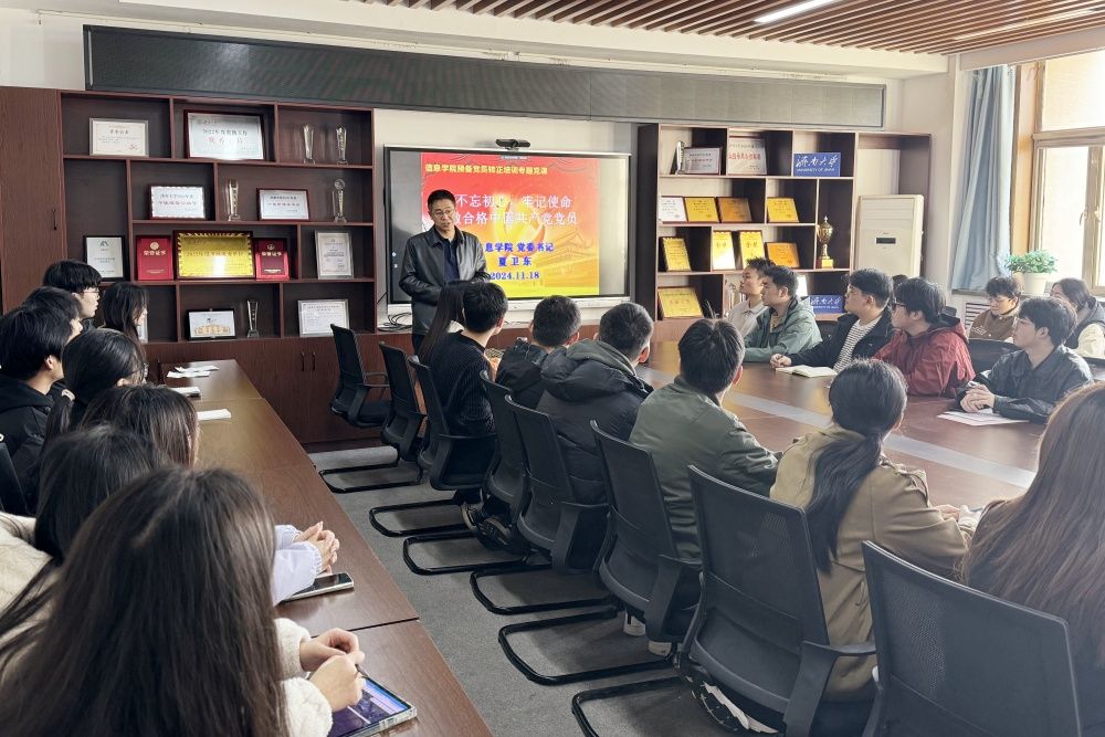 按照《中国共产党党员教育管理工作条例》要求,为进一步做好预备党员转正培训教育工作,提高预备党员的政治素养和理论水平,11月18日,pg娱乐电子游戏官网入口党委书记夏卫东以《不忘初心,牢记使命做合格的中国共产党党员》为题,为学院2024年下半年即将转正的44名预备党员讲授专题党课,组织员、学生党支部支委参加了此次培训。