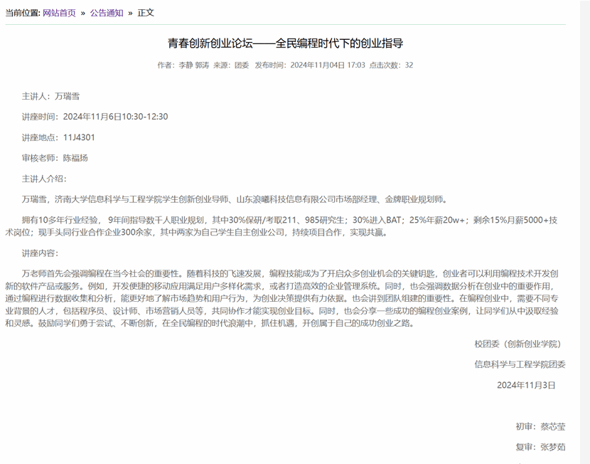 随着编程技术的普及和应用的不断拓展,pg娱乐电子游戏官网入口于2024年11月6日在11J4301举办了一场主题为“青春创新创业论坛——全民编程时代下的创业指导”的讲座。此次活动特别邀请了万瑞雪,一位在编程和创业领域具有深厚背景的专家,为学生们带来了一场充满洞见的分享会。