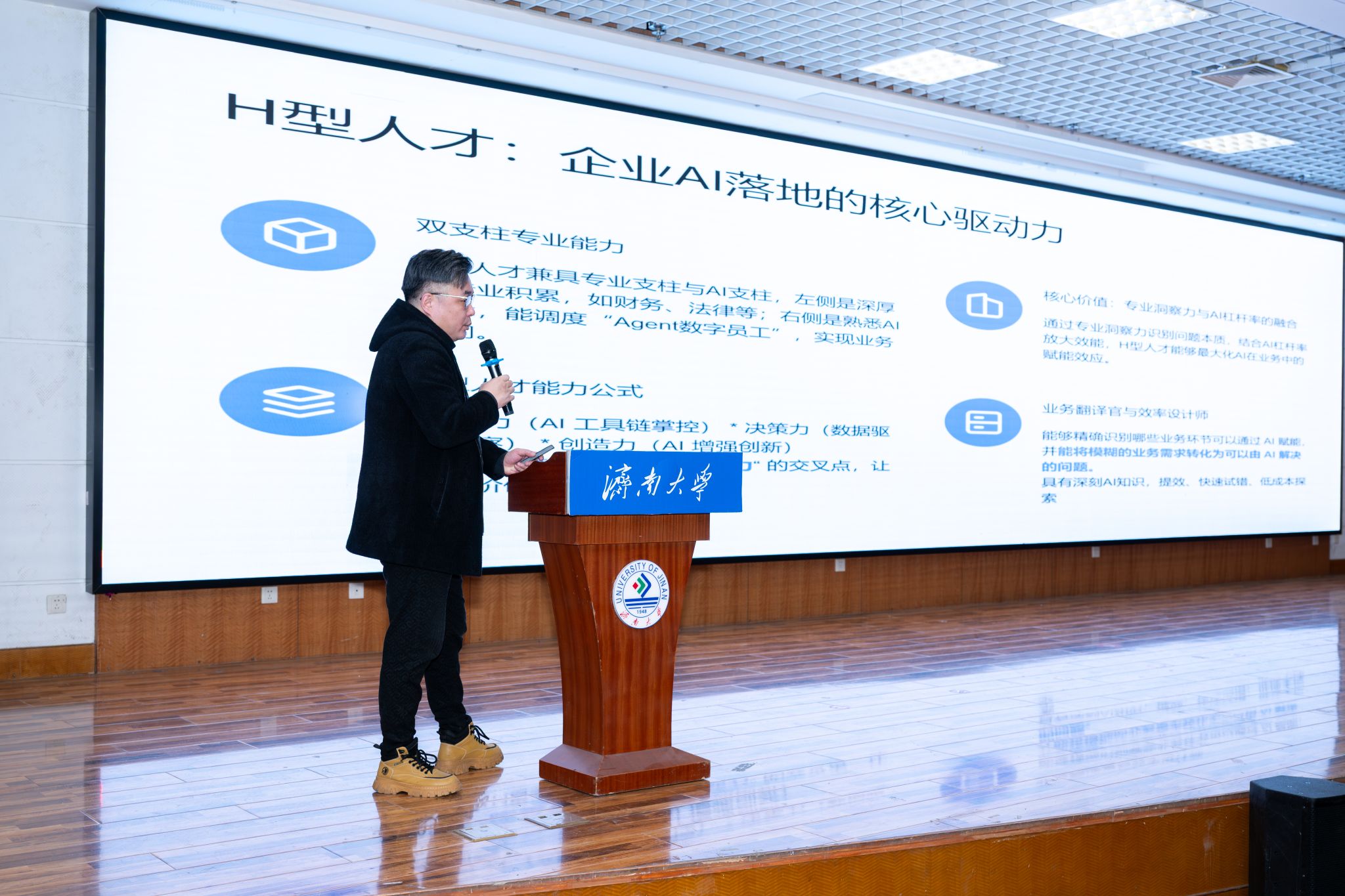 在专题报告环节,王海宁以“神经元到人才新势力:AI核心技术、Agent模式与未来职业路径”为题作报告。他结合自身在大型系统开发、数据库架构与性能优化等领域的丰富产业实践经验,系统梳理了AI技术从理论到应用的全链条逻辑,并结合国家“人工智能+”战略,强调了AI在推动新型工业化、赋能千行百业中的重要作用。现场互动环节中,同学们围绕AI发展趋势、学科交叉融合与职业规划等话题踊跃交流。大家纷纷表示,通过此次讲座,不仅对AI大模型有了更系统、更清晰的认识,也更加明确了在智能时代背景下个人成长与奋斗的方向。